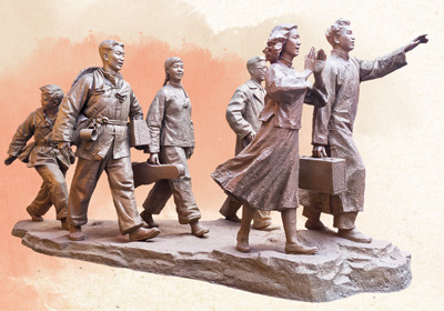 大地铭记·时代的号角“舞台艺术特辑”图为中国共产党历史展览馆漆壁画《长城颂》(部分),主创程向军。图片从上至下依次为歌剧《白毛女》(郭兰英主演)、京剧《杨靖宇》、话剧《四世同堂...